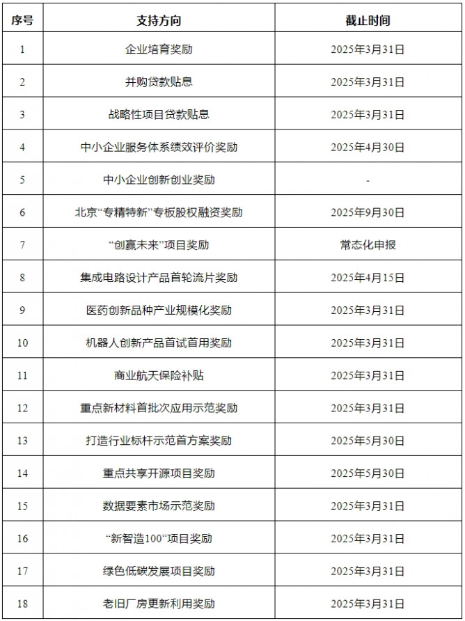為貫徹落實(shí)中央經(jīng)濟(jì)工作會(huì)議、市委十三屆六次全會(huì)精神,堅(jiān)持“穩(wěn)中求進(jìn)、以進(jìn)促穩(wěn),守正創(chuàng)新、先立后破,系統(tǒng)集成、協(xié)同配合”工作要求,促進(jìn)產(chǎn)業(yè)高質(zhì)量發(fā)展,推動(dòng)經(jīng)濟(jì)平穩(wěn)增長(zhǎng),塑造發(fā)展新動(dòng)能新優(yōu)勢(shì),根據(jù)《北京市高精尖產(chǎn)業(yè)發(fā)展項(xiàng)目資金管理辦法》《北京市支持中小企業(yè)發(fā)展資金管理辦法》等文件規(guī)定,現(xiàn)發(fā)布2025年北京市高精尖產(chǎn)業(yè)發(fā)展項(xiàng)目資金和支持中小企業(yè)發(fā)展資金實(shí)施指南(第一批)(以下簡(jiǎn)稱實(shí)施指南)。