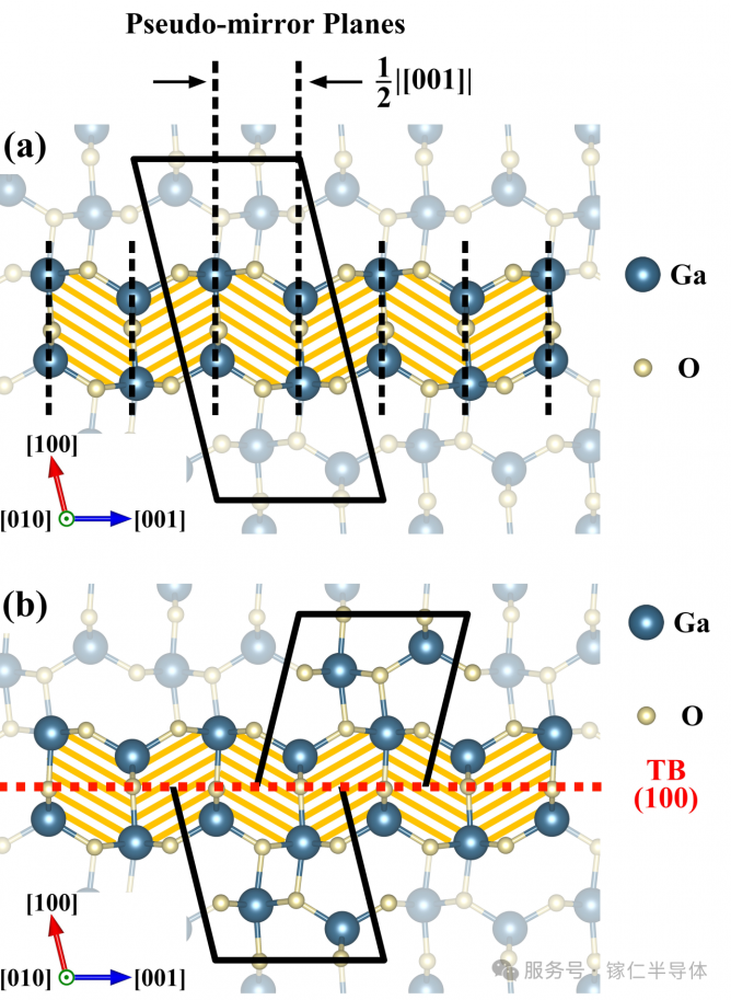 【圖2】 (a)β-Ga2O3中的準對稱原子層;(b)建立于準對稱性上的β-Ga2O3的(100)面孿晶
