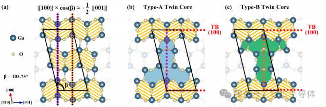 【圖3】(a)β-Ga2O3的特殊“晶格巧合”;(b)β-Ga2O3中的A型孿晶核心;(c)β-Ga2O3中的B型孿晶核心