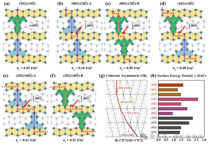【圖4】(a)-(f)由孿晶核心拓展成的三位共格非對稱孿晶;(g)共格非對稱孿晶在宏觀上表現(xiàn)為由兩個不同的晶面組成的孿晶界;(f)構(gòu)成共格非對稱孿晶的晶面的表面能