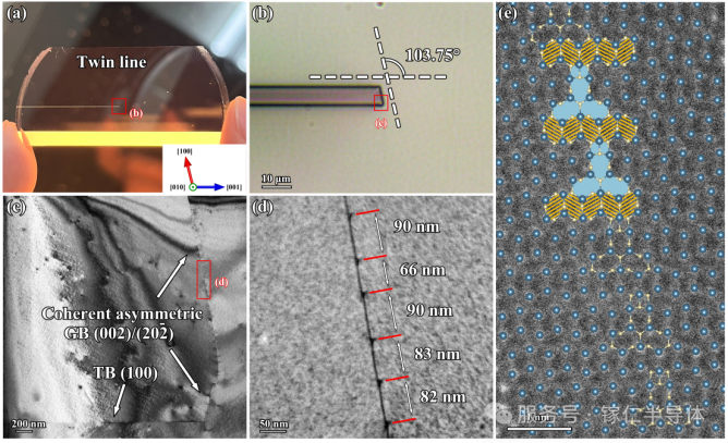 【圖5】 采用直拉法生長的2英寸β-Ga2O3單晶中的共格非對稱孿晶,采用(a)偏光應(yīng)力儀;(b)光學(xué)顯微鏡;(c)TEM;(d)STEM與(e)HAADF-STEM觀察的共格非對稱孿晶的結(jié)構(gòu)。