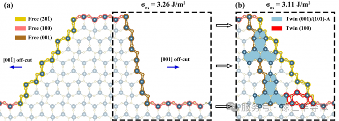 【圖6】 (a)β-Ga2O3(100)襯底沿[001]方向斜切暴露出(001)臺階面,沿[00-1]方向斜切暴露出(-201)臺階面。(b)在(001)臺階面上,由共格非對稱孿晶導(dǎo)致的臺階處的孿晶缺陷,其能量低于無缺陷的臺階。