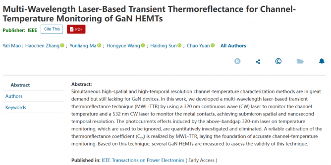 論文詳情:Y. Mao, H. Zhang, Y. Ma, H. Wang, H. Sun and C. Yuan, Multi-Wavelength Laser-based Transient Thermoreflectance for Channel-Temperature Monitoring of GaN HEMTs, IEEE Transactions on Power Electronics, doi: 10.1109/TPEL.2025.3539756.
