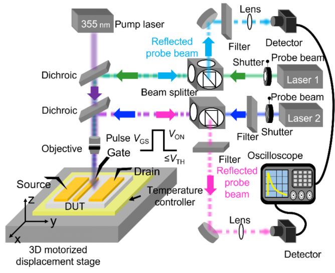 團隊研發(fā)了基于多波長激光的瞬態(tài)熱反射(MWL-TTR)技術(shù),采用不同波長檢測不同區(qū)域(金屬觸點、溝道等)溫度。相比商業(yè)化TTI方法,使用更短波長(320 nm)監(jiān)測溝道,使得探測位置更接近溝道表面自發(fā)熱區(qū)域,測試誤差優(yōu)于±10%。測試空間分辨率達到亞微米級,瞬態(tài)測試時間分辨率達到納秒級。對320 nm激光誘導(dǎo)的光電流進行了定量研究,將光電流干擾減小至<5%。結(jié)合課題組在熱反射機理方面的預(yù)研工作(J. Appl. Phys., 134, 115102, 2023;Materials Today Physics, 42, 101367,2024.),創(chuàng)新應(yīng)用泵浦-探測瞬態(tài)熱反射測試方法實現(xiàn)Cth校準(zhǔn),為溝道溫度表征提供穩(wěn)定可靠的Cth結(jié)果。MWL-TTR技術(shù)最終應(yīng)用于GaN HEMTs不同工作狀態(tài)(瞬態(tài)、穩(wěn)態(tài))溫度掃描成像測試,且兼具檢測其他類型器件的能力(GaAs、Si、SiC、Ga2O3基器件)。