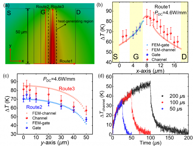 圖2. (a) 器件掃描測量路線和發(fā)熱區(qū)域示意圖。(b) 路線1中器件(柵極和溝道)的測量和有限元(FE)模型模擬瞬態(tài)溫升(?T)。(c) 路線2和路線3中器件柵極和溝道的?T。(d) 不同脈沖周期下器件的瞬態(tài)溝道?T測量值。