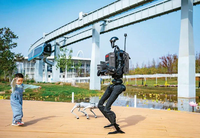 圖為2024年11月14日,在武漢東湖高新區(qū)空軌高新大道站,一輛空軌列車(chē)正在駛過(guò);生態(tài)大走廊上,裝載了光谷造“大腦”的人形機(jī)器人和四足機(jī)器狗,正與看AI展的小朋友斗舞
