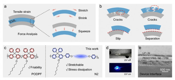 針對(duì)上述問(wèn)題,黃維院士團(tuán)隊(duì)通過(guò)熱塑性功能化策略,利用具有優(yōu)異應(yīng)變能力的可拉伸聚合物半導(dǎo)體作為發(fā)光層,研制了柔性極高的聚合物發(fā)光二極管。本研究采用Suzuki聚合合成了非共軛熱塑性發(fā)光聚合物N2,在應(yīng)力作用下表現(xiàn)出優(yōu)異的能量耗散能力。基于N2的聚合物發(fā)光二極管表現(xiàn)出穩(wěn)定的深藍(lán)色電致發(fā)光,薄膜拉伸率為50%,EQE保持原始器件的80%。與基于脆性聚合物PODPF所制備的器件相比,此熱塑性薄膜器件即使在數(shù)百次彎曲疲勞循環(huán)后,性能也未明顯退化。本研究證明,非共軛熱塑性薄膜可抑制層內(nèi)拉伸斷裂和壓縮分離,以提高柔性發(fā)光二極管的形變后的性能穩(wěn)定性,展示了該類聚合物在可穿戴器件領(lǐng)域具有廣闊的應(yīng)用潛力。