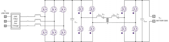 該轉(zhuǎn)換器階段通常采用 LLC、CLLC、移相全橋或雙有源橋等拓?fù)浣Y(jié)構(gòu)。在此類設(shè)計(jì)中,開(kāi)關(guān)損耗不太重要,盡管組件仍需承受高 di/dt 和 dv/dt 應(yīng)力,并處理高諧振電路電流。