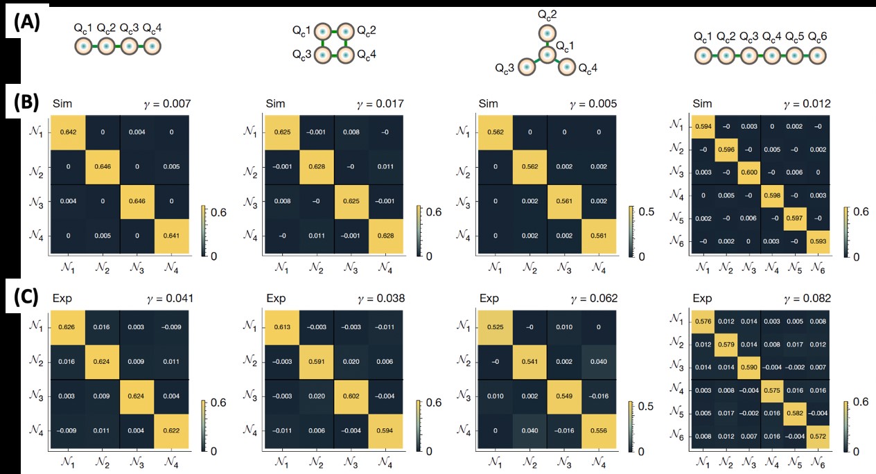 圖3. 不同糾纏結(jié)構(gòu)的連續(xù)變量簇態(tài)實(shí)驗(yàn)結(jié)果:nullifier非對角噪聲關(guān)聯(lián)矩陣。