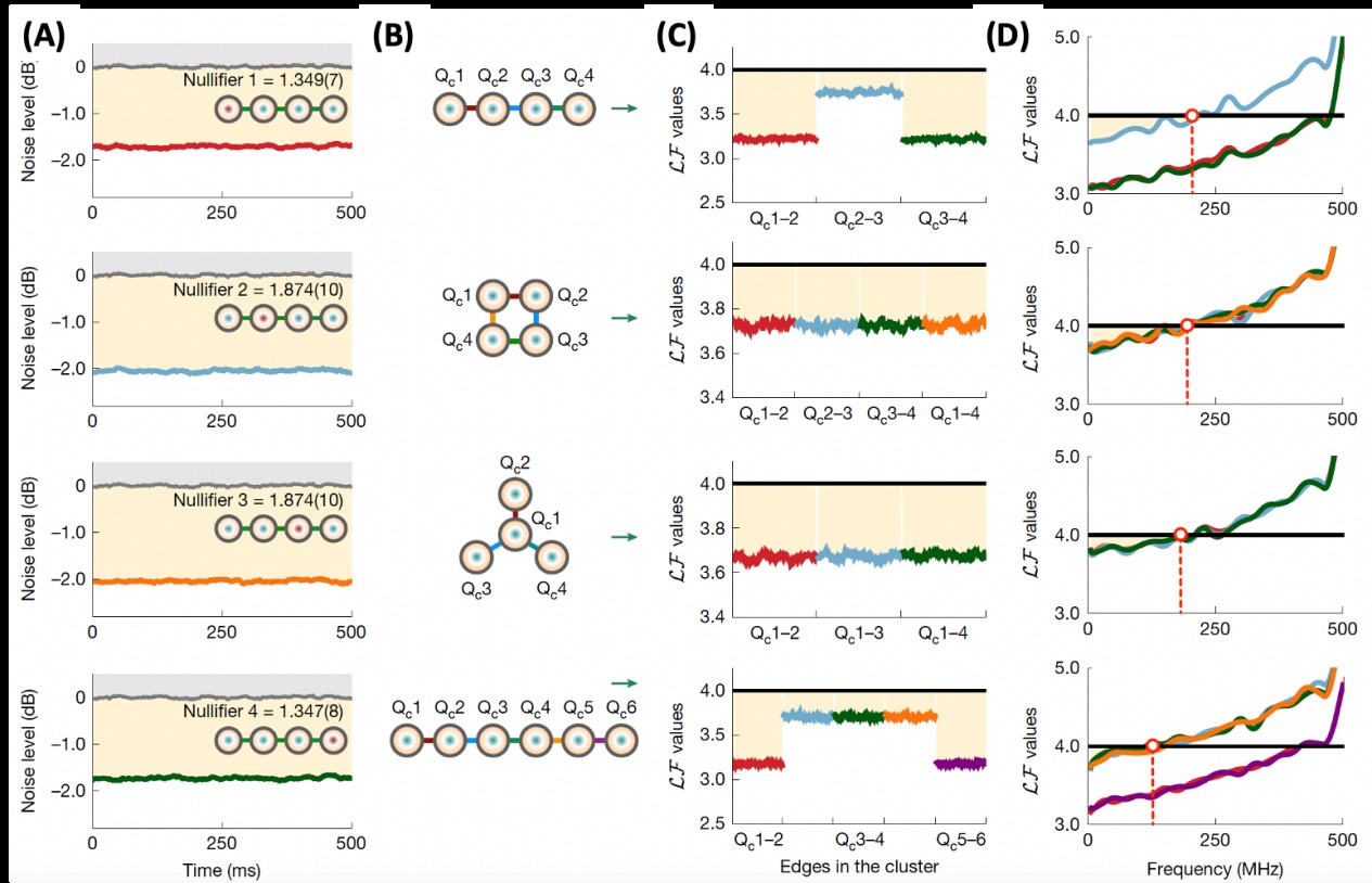 圖2. 不同糾纏結(jié)構(gòu)的連續(xù)變量簇態(tài)實(shí)驗(yàn)結(jié)果:(A)Nullifier;(B) 不同糾纏結(jié)構(gòu)簇態(tài);(C)van Loock-Furusawa判據(jù)實(shí)驗(yàn)結(jié)果;(D)100MHz寬帶糾纏判定。