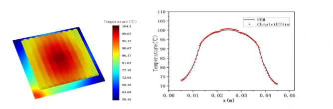 針對以上問題,微電子所EDA中心多物理場仿真課題組構建了芯粒集成三維網(wǎng)格型瞬態(tài)熱流仿真模型,能夠實現(xiàn)Chiplet集成芯片瞬態(tài)熱流的高效精確仿真,為芯粒異構集成溫度熱點檢測和溫感布局優(yōu)化奠定了核心技術基礎。同時,課題組在集成芯片電熱力多物理場仿真方面進行布局,開展了直流壓降、熱應力和晶圓翹曲仿真等研究工作。