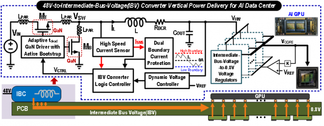 根據(jù)統(tǒng)計(jì),基于第三代半導(dǎo)體氮化鎵的高效率智能供電設(shè)備,每年可為大型數(shù)據(jù)中心運(yùn)營(yíng)商減少超過(guò)數(shù)十億美元的能源成本,并減少近幾百萬(wàn)噸的二氧化碳排放量。為此,課題組提出了一款應(yīng)用于大功率AI數(shù)據(jù)中心的基于氮化鎵的高效率智能供電轉(zhuǎn)換芯片。該芯片在48V/12V的轉(zhuǎn)換條件下,單相可提供至少百瓦的輸出功率,多相條件下可以提供近千瓦的輸出功率。并且,結(jié)合實(shí)時(shí)高精度溫度檢測(cè)、全波形電流檢測(cè)、以及溫度補(bǔ)償和自適應(yīng)斜率擬合方案,該芯片在全溫度范圍內(nèi)可生成精確的雙向電流檢測(cè)信號(hào),實(shí)現(xiàn)大功率、高轉(zhuǎn)換效率以及多重保護(hù)來(lái)實(shí)現(xiàn)數(shù)據(jù)中心供電系統(tǒng)的穩(wěn)定性和工業(yè)可靠性。