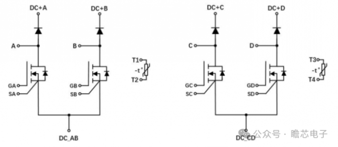 這款模塊產(chǎn)品(IV3B20023BA2)內(nèi)部集成了4相升壓電路,共用電源接地,分為2組,集成熱敏電阻以監(jiān)測溫度,如下圖3,可靈活適配2路或者4路直流輸入(DC input),滿足個性化設(shè)計需求。相對于分立器件方案,大幅提升功率密度,同時顯著簡化了電路的設(shè)計。