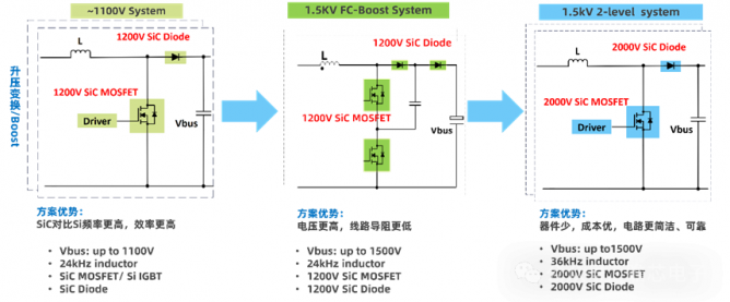 2000V SiC MOFET和Diode特別適用于1500V 光伏升壓電路(MPPT)。如下圖3所示,在升壓變換電路中,2000V SiC分立器件能簡化電路拓撲、減少元器件數(shù)量,降低總物料成本,同時讓應(yīng)用控制更簡單:
