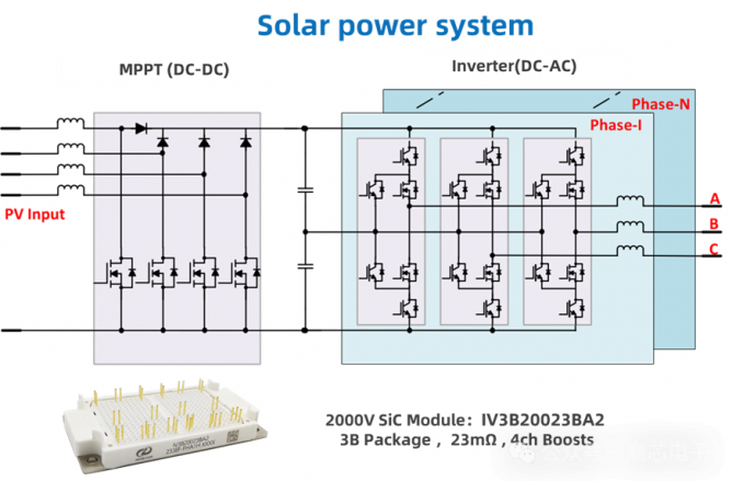 對比分立器件的方案,若采用2000V SiC功率模塊產(chǎn)品(IV3B20023BA2),除了上述優(yōu)勢,還進一步簡化了電路設(shè)計,大幅提升了功率密度,如下圖4所示: