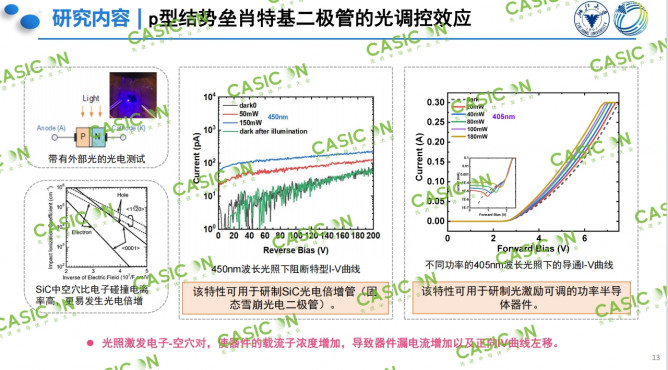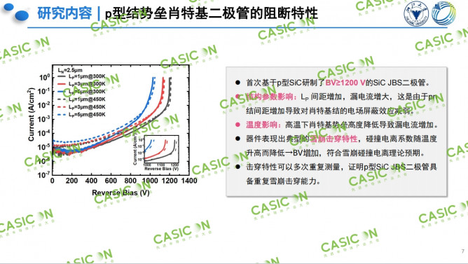 研究顯示,采用頂籽溶液生長(zhǎng)(TSSG)法制備高質(zhì)量p型SiC襯底,p型JBS二極管達(dá)到了1200V的耐壓水平。較高的肖特基勢(shì)壘和較低的空穴遷移率,導(dǎo)致 pn 結(jié)更早被觸發(fā),從而進(jìn)入雙極導(dǎo)電模式。表現(xiàn)出較低的導(dǎo)通電阻,尤其在高溫下優(yōu)勢(shì)更加明顯。p 型SiC JBS在高溫下的導(dǎo)通電阻顯著降低,表明其適合于高溫功率應(yīng)用。 在 p 型SiC功率器件中觀(guān)察到電致發(fā)光(EL)現(xiàn)象,并研究了其光譜特性。器件的發(fā)光特性(發(fā)光峰波長(zhǎng)以及發(fā)光強(qiáng)度)與器件的導(dǎo)通電流與結(jié)溫有明顯的關(guān)聯(lián)性。且隨著電流增加,EL 主要來(lái)自于導(dǎo)帶-受主能級(jí)的載流子復(fù)合,并表現(xiàn)出光強(qiáng)與電流的線(xiàn)性關(guān)系。外部光照導(dǎo)致器件漏電流增加、I-V 曲線(xiàn)左移,為 SiC 功率器件的光學(xué)傳感和光電集成應(yīng)用提供了可能性。