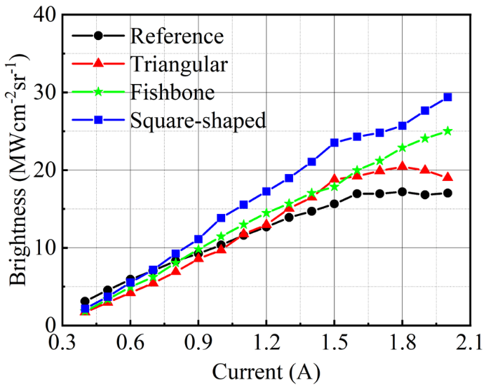 針對這一難題,長春光機所Bimberg中德綠色光子學(xué)研究中心團隊在垂直方向上,采用高亮度垂直寬區(qū)邊發(fā)射(HiBBEE)結(jié)構(gòu),利用光子帶隙效應(yīng)替代傳統(tǒng)的全反射原理進行光場限制,提高光模式尺寸,減小半導(dǎo)體激光器垂直方向發(fā)散角;同時在側(cè)向方向上,采用非均勻波導(dǎo)抑制側(cè)向高階模式,提高半導(dǎo)體激光器側(cè)向光束質(zhì)量,優(yōu)化設(shè)計并制備了HiBBEE非均勻波導(dǎo)半導(dǎo)體激光器。達到1.5A電流下垂直和側(cè)向發(fā)散角半高全寬仍低至8.6°和5.1°,并保持基模輸出,亮度相比于同類型器件提升1.5倍的良好效果。