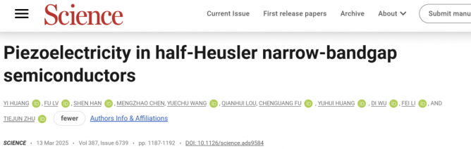 近日,浙江大學材料科學與工程學院朱鐵軍教授團隊首次觀察到TiNiSn、ZrNiSn、TiCoSb三種半赫斯勒(half-Heusler)窄禁帶半導體材料的壓電效應,制備了基于TiCoSb-[111]切型晶片的原型壓電器件,該器件展現(xiàn)出穩(wěn)定的壓電響應并實現(xiàn)為電容器充電,同時,半赫斯勒材料的壓電響應在室溫至1173K范圍內保持穩(wěn)定,這些結果表明半赫斯勒窄帶半導體材料在壓電領域具有潛在應用前景。相關研究成果以《Piezoelectricity in half-Heusler narrow-bandgap semiconductors》為題于2025年3月14日在線發(fā)表于國際學術期刊《科學》上。該研究獲得了浙江省自然科學基金等的資助。