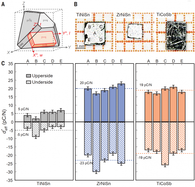 瞄準這個領域,為了測定壓電系數(shù),朱鐵軍教授團隊首先制備了TiNiSn、ZrNiSn和TiCoSb半赫斯勒單晶的[111]切型晶片(圖1)。通過準靜態(tài)壓電常數(shù)測試方法得到[111]切型晶片的垂直壓電應變常數(shù)(圖1),再根據(jù)剪切壓電應變系數(shù)d14與[111]切型晶片垂直壓電應變常數(shù)的31/2倍數(shù)關系,首次在實驗上確定了TiNiSn、ZrNiSn和TiCoSb的剪切壓電應變系數(shù)d14分別約為8 pC/N、38 pC/N和33 pC/N。其中,ZrNiSn和TiCoSb單晶的剪切壓電系數(shù)在非中心對稱、非極性壓電材料中屬于較高數(shù)值,高于SiO2、GaSb等寬禁帶壓電材料。
