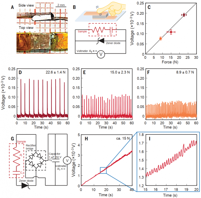 團隊研發(fā)了基于TiCoSb-[111]切型晶片的壓電器件,該器件在不同施力大小和持續(xù)時間下展現(xiàn)出穩(wěn)定的電壓響應,且能夠為電容器持續(xù)充電(圖2)。此外,團隊發(fā)現(xiàn)半赫斯勒材料在室溫至1173K范圍內表現(xiàn)出良好的熱穩(wěn)定性,其壓電響應也在該溫區(qū)保持穩(wěn)定。