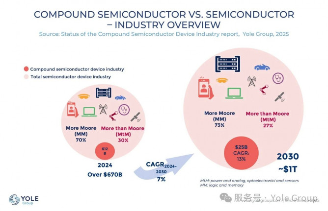 據(jù)Yole Group最新發(fā)布的市場(chǎng)與技術(shù)報(bào)告Status of the Compound Semiconductor Device Industry,預(yù)計(jì)到 2030 年化合物半導(dǎo)體器件市場(chǎng)規(guī)模將達(dá)到 250 億美元,盡管其在全球 1 萬(wàn)億美元的半導(dǎo)體市場(chǎng)中占比仍然較小。但從更深層次來(lái)看,化合物半導(dǎo)體已成為推動(dòng)行業(yè)變革的關(guān)鍵技術(shù)。