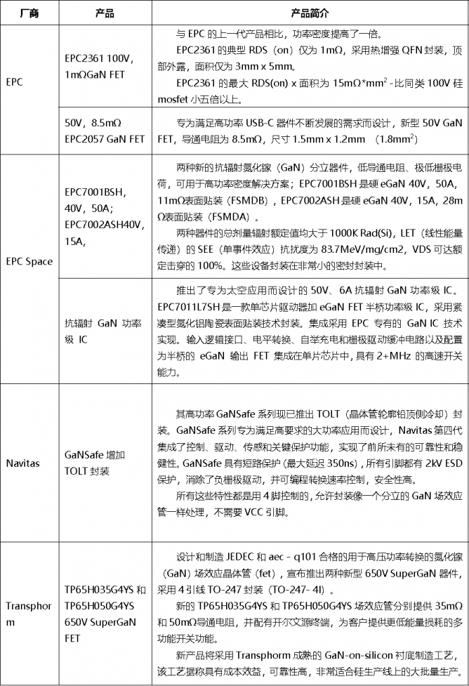 國(guó)外主流企業(yè)推出的GaN新品情況