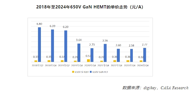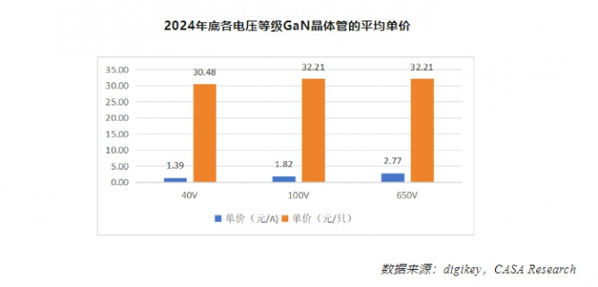 就價(jià)格來(lái)看,2024年底整體GaN晶體管的平均單價(jià)約2.4元/A;大部分單只產(chǎn)品的價(jià)格低于70元/只。