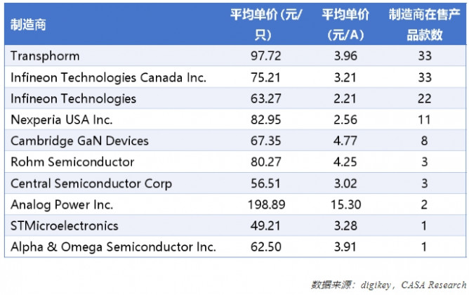 從廠家來(lái)看,Infineon、Transphorm目前在售產(chǎn)品較多,其產(chǎn)品均價(jià)基本在3元/A。而刨除Analog Power Inc.外,Cambridge GaN Devices、Rohm Semiconductor相對(duì)均價(jià)較高,兩者目前供應(yīng)的品類(lèi)相對(duì)較少。