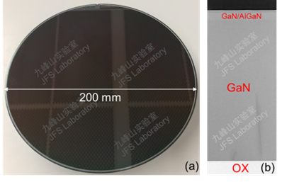 (a) 九峰山實驗室8英寸N極性GaN晶圓實物照片, (b) N極性GaNOI截面透射電鏡照片