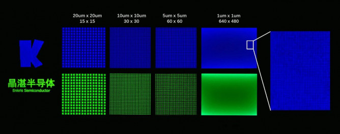 現場晶湛半導體演示了基于ZDP™平臺驗證的200mm Full Color GaN®全彩系列LED外延片,像素尺寸在1µm至50µm范圍內的高良率RGB micro-LED陣列,即便像素尺寸微縮至1µm,在640x480的陣列規(guī)模下(圖2),全陣列無任何壞點,充分展現了晶湛半導體在Micro-LED技術領域的深厚積累與創(chuàng)新能力,也將進一步推動AR設備向商業(yè)化、產業(yè)化演進。