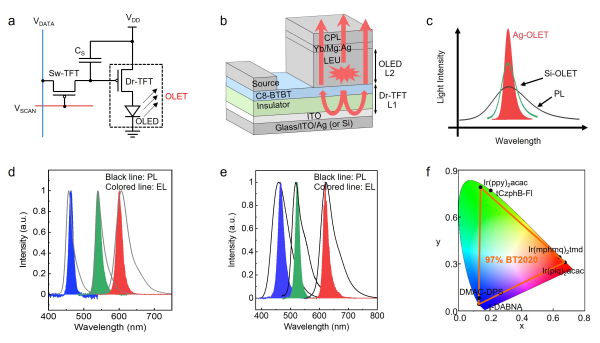 通過引入全反射基底和半透明頂電極,在理論模擬指導(dǎo)下,對于具有不同發(fā)光波長的紅、綠、藍材料,有機發(fā)光晶體管的強微腔效應(yīng)能夠?qū)崿F(xiàn)光譜的有效窄化和器件效率提升。研究表明,該方法展現(xiàn)出對7種本征窄/寬光譜材料的光譜窄化效果的普適性;紅、綠、藍有機發(fā)光晶體管的最小半峰寬值分別達到18nm、14nm、13nm,相較于光致發(fā)光光譜,最大窄化程度達68%,色域覆蓋達BT.2020標準的97%。