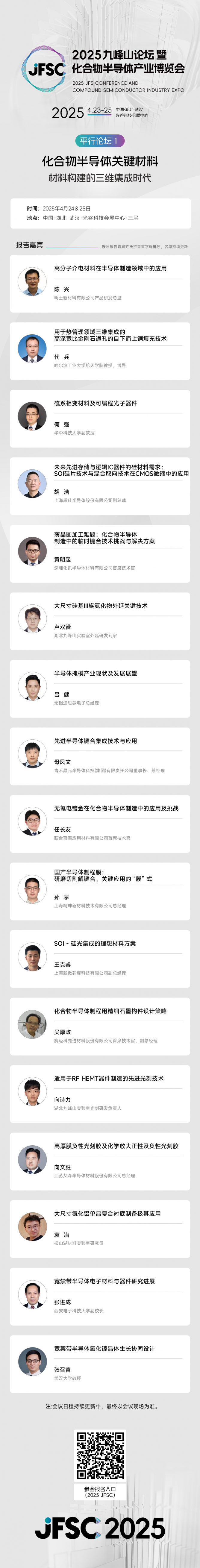 2025年4月23-25日,第三屆九峰山論壇(JFSC)暨化合物半導(dǎo)體產(chǎn)業(yè)博覽會(huì)(CSE)將在武漢光谷科技會(huì)展中心盛大啟幕。作為其中的重頭戲,九峰山論壇延續(xù)往年的多元化架構(gòu),以1場(chǎng)主論壇、11場(chǎng)平行論壇的強(qiáng)大陣容,攜手全球相關(guān)領(lǐng)域權(quán)威科研機(jī)構(gòu)、領(lǐng)軍企業(yè)及行業(yè)專家代表,共同探索化合物半導(dǎo)體產(chǎn)業(yè)未來發(fā)展方向。