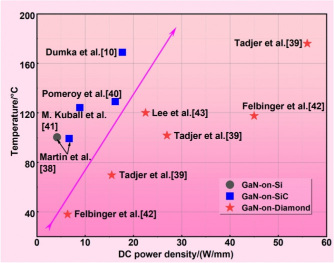 圖1 不同襯底的GaN功率器件在熱性能方面的基準(zhǔn)測試:硅基GaN[38]、碳化硅基GaN[10,38,40,41]和金剛石基GaN[39,42,43]