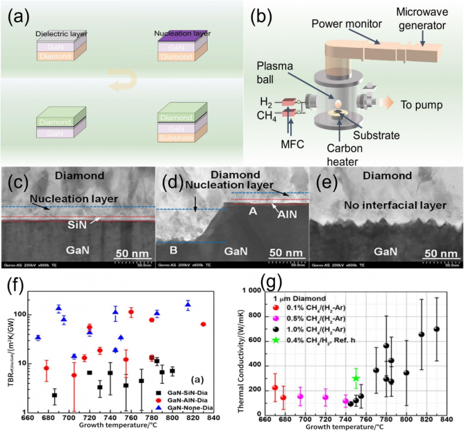 隨著消費(fèi)電子行業(yè)的迅猛發(fā)展,電子設(shè)備對高功率和高效散熱的需求日益迫切。GaN材料雖具備諸多優(yōu)異特性,理論上能實(shí)現(xiàn)超高功率密度,但實(shí)際應(yīng)用中,其產(chǎn)生的大量熱量難以有效散發(fā),導(dǎo)致結(jié)溫升高,嚴(yán)重限制了器件性能。當(dāng)器件功率密度達(dá)到6 W/mm時,溝道溫度可超200 ℃,極大縮短了器件壽命。而傳統(tǒng)的硅(Si)、碳化硅(SiC)等襯底材料,因熱導(dǎo)率有限,無法滿足GaN器件的散熱需求。在此背景下,具有超高熱導(dǎo)率(2 200 W/m/K)的金剛石脫穎而出。將金剛石作為GaN器件的襯底,能顯著提升散熱效率,有效降低結(jié)溫,增強(qiáng)器件的可靠性和穩(wěn)定性,GaN-on-diamond技術(shù)應(yīng)運(yùn)而生。