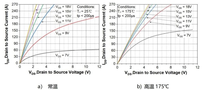 該產(chǎn)品額定電壓為1.2kV,額定電流超過(guò)220A,室溫閾值電壓典型值為2.7~2.8V。圖2分別給出了該芯片在常溫及高溫的輸出特性曲線,體現(xiàn)了優(yōu)良的導(dǎo)通電阻溫度特性。在等效的芯片面積下,與上一代技術(shù)相比導(dǎo)通損耗降低約20%,能夠以更高的效率、更小的封裝和更高的可靠性實(shí)現(xiàn)應(yīng)用設(shè)計(jì)。值得指出的是,和傳統(tǒng)芯片迭代技術(shù)方式不同,該芯片在降低導(dǎo)通電阻的同時(shí)保持了與前兩代相近的優(yōu)良短路耐受特性。