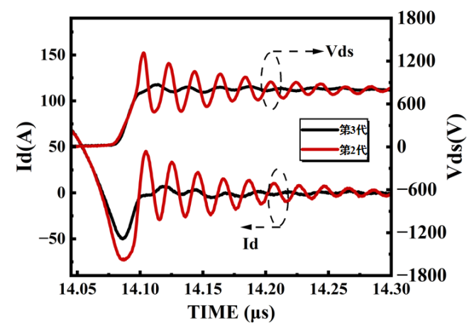 圖3 S3M008120BK芯片與2代同類(lèi)產(chǎn)品反向恢復(fù)波形對(duì)比