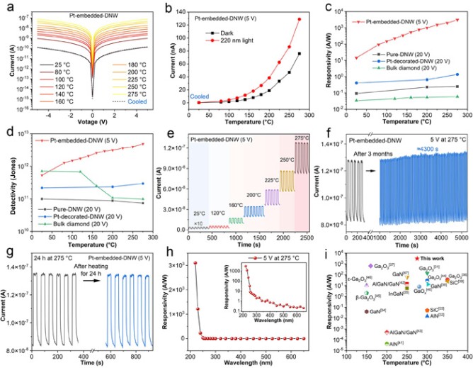 圖4. 單晶金剛石納米線光電探測器的高溫日盲紫外光電探測性能