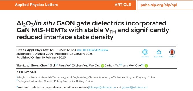 近日,中國科學(xué)院寧波材料技術(shù)與工程研究所郭煒研究員在GaN HEMT器件研究中取得新進展,相關(guān)工作以Al2O3/in-situ GaON gate dielectrics incorporated GaN MIS-HEMTs with stable VTH and significantly reduced interface state density(具有高閾值電壓穩(wěn)定性和低界面態(tài)密度的Al2O3/原位GaON柵介質(zhì)高電子遷移率晶體管研究)為題發(fā)表在學(xué)術(shù)期刊Applied Physics Letters中。