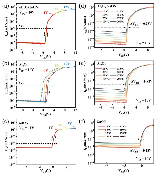 圖1,采用Al?O?/in situ GaON 雙層介質(zhì)(a, d),單一Al?O?介質(zhì)(b, e),單一GaON介質(zhì)(c, f)的MIS-HEMT在不同柵偏壓和溫度下的轉(zhuǎn)移特性曲線