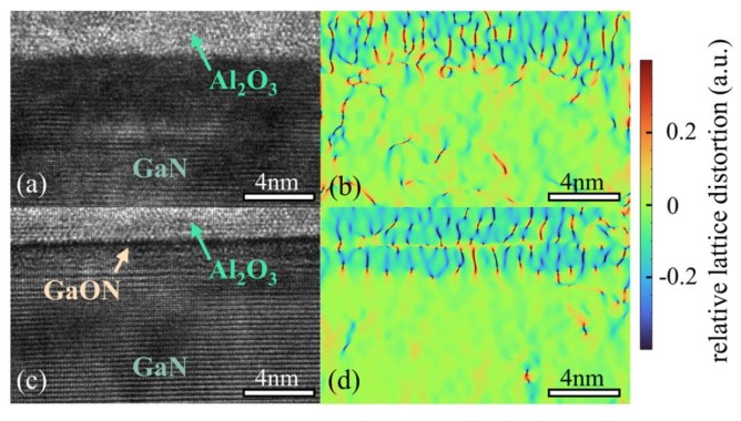 圖2 在Al?O?/GaN 和 Al?O?/in situ GaON/GaN界面處的高分辨透射電子顯微鏡及對應(yīng)的晶格常數(shù)分布圖:Al?O?/GaN界面(a, b),Al?O?/in situ GaON/GaN界面(c, d)