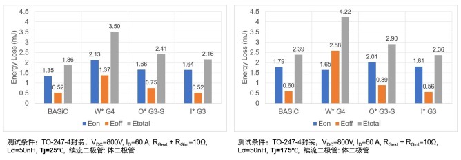 開關損耗 Eoff/Etotal 在常溫和高溫下均優(yōu)于W*/O*國際競品,高溫下Eon與國際競品W*接近。