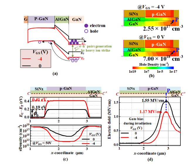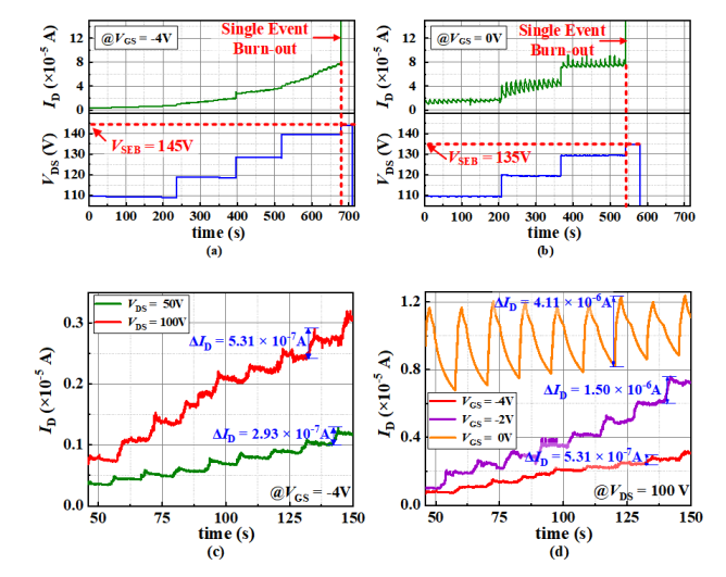本工作中,團隊對處于負柵壓阻斷態(tài)和零柵壓阻斷態(tài)的器件進行了破壞性與非破壞性輻照實驗。輻射離子為線性能量轉(zhuǎn)移(LET)為78.40 MeV/(mg/cm2)的Ta離子。在整個輻照過程中,平均輻照劑量率維持在1.0 × 104 ions?cm-2?s-1。如圖1(a)所示,在破壞性實驗中,漏源電壓(VDS)以10 V的步長從110 V開始逐漸增加直至器件發(fā)生燒毀;當柵極電壓為-4V時,器件的VSEB為145V,高于柵極電壓為0V時的135V。非破壞性實驗則是對器件施加劑量為1.5 × 106 ions?cm-2的輻照,如圖1(b)所示,當VDS越高,器件內(nèi)的電場峰值越高,重離子通過碰撞電離產(chǎn)生更多的電子-空穴對,輻照期間的瞬態(tài)電流峰值越高;而柵極電壓越負,則輻照期間的瞬態(tài)電流峰值越低,意味著負柵極電壓可有效改善器件的抗輻照魯棒性。