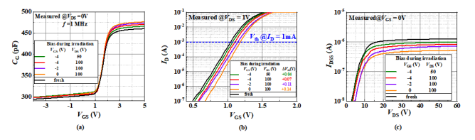 圖3 (a) 輻照前后的柵電容變化情況。(b) 輻照前后的轉(zhuǎn)移特性曲線對比。 (c) 輻照前后的阻斷態(tài)泄漏電流對比。