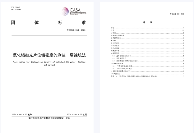 2025年5月20日,由奧趨光電技術(shù)(杭州)有限公司牽頭制定的T/CASAS 053—2025《氮化鋁拋光片位錯(cuò)密度的測(cè)試 腐蝕坑法》以及由中國(guó)科學(xué)院半導(dǎo)體研究所牽頭制定的T/CASAS 054—2025《氮化鋁拋光片吸收系數(shù)測(cè)試方法》,遵循CASAS標(biāo)準(zhǔn)制定流程,經(jīng)過(guò)標(biāo)準(zhǔn)起草小組會(huì)議討論、廣泛征求意見(jiàn)、委員會(huì)草案投票等流程,上述兩項(xiàng)技術(shù)標(biāo)準(zhǔn)正式面向產(chǎn)業(yè)發(fā)布。