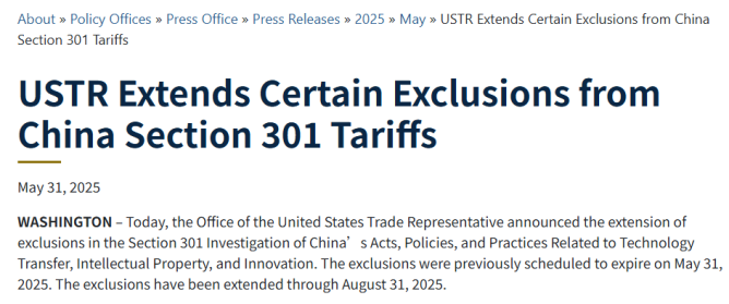 當(dāng)?shù)貢r(shí)間5月31日,美國(guó)貿(mào)易代表辦公室發(fā)布消息,決定延長(zhǎng)針對(duì)中國(guó)在技術(shù)轉(zhuǎn)讓、知識(shí)產(chǎn)權(quán)和創(chuàng)新領(lǐng)域相關(guān)行為、政策及做法的“301條款”調(diào)查中部分產(chǎn)品的關(guān)稅豁免期限。原定于2025年5月31日到期的豁免期,此次被延長(zhǎng)至2025年8月31日。