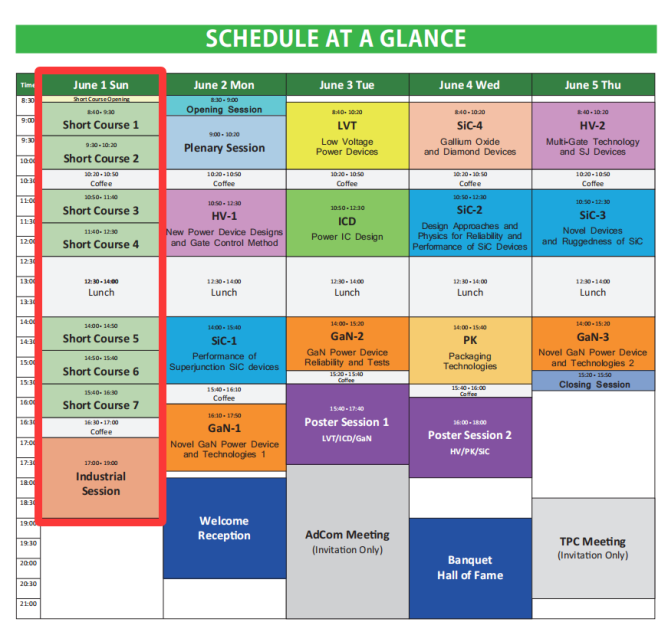 開幕大會前的Short Course中,一共有7個,分別涵蓋碳化硅襯底材料、氮化鎵功率器件、硅功率器件、功率IC 技術(shù)、EDA設(shè)計,可靠性與監(jiān)測、以及先進(jìn)封裝 等方向。