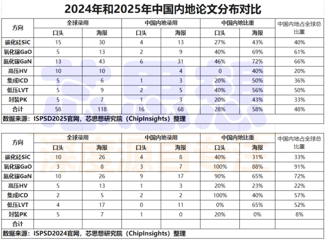芯思想統(tǒng)計表顯示,ISPSD 2025中國內(nèi)地投稿占全球總比重為48%。其中在氮化鎵(GaN 66%)和氧化鎵(GaO 61%)方向具備優(yōu)勢;在碳化硅(SiC 40%)、功率集成設(shè)計(ICD 36%)、低壓器件(LVT 50%)方向研究上實力不俗;在封裝(PK 33%)研究方面呈現(xiàn)逐年上升趨勢,但是在高壓器件(HV 20%)方向研究上稍顯不足,有待進(jìn)一步加強(qiáng)。