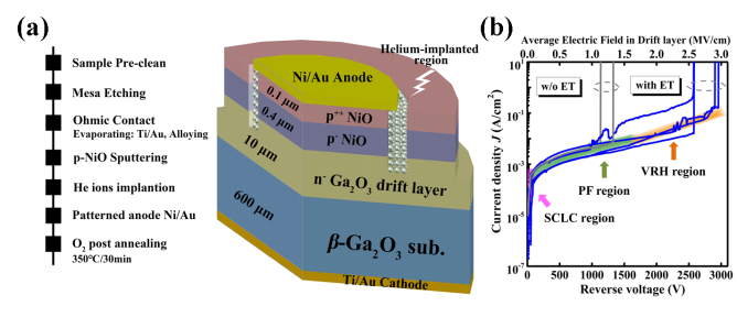 圖2.具有He離子注入終端的β-Ga2O3 HJDs(a)截面示意圖和制造關(guān)鍵工藝,(b)反向擊穿特性曲線。