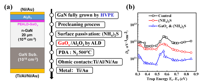 圖3.具有GaOx界面層的垂直GaN MOS電容(a)結(jié)構(gòu)示意圖及關(guān)鍵工藝,(b)器件的界面態(tài)密度參數(shù)提取。