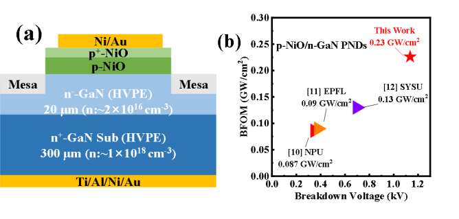 圖4.(a)NiO/GaN垂直pn HJD的結(jié)構(gòu)示意圖,(b)之前報道的NiO/GaN PND的FOM與擊穿電壓的對比。